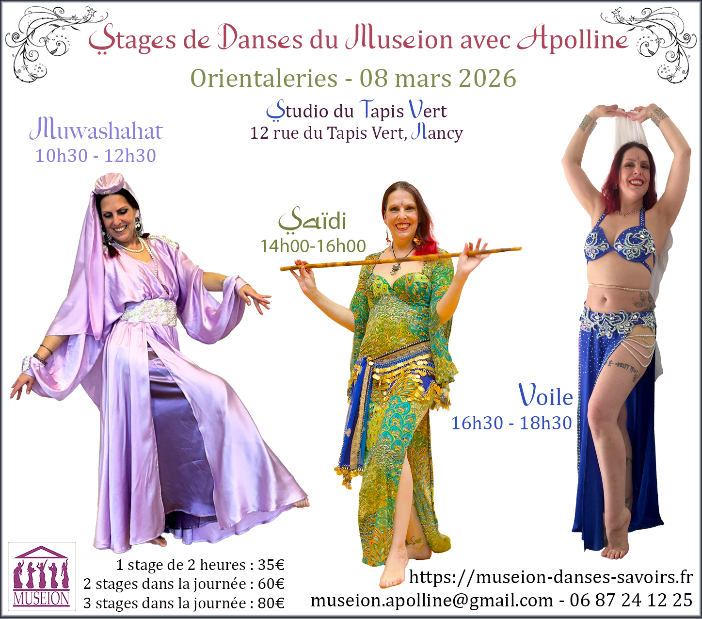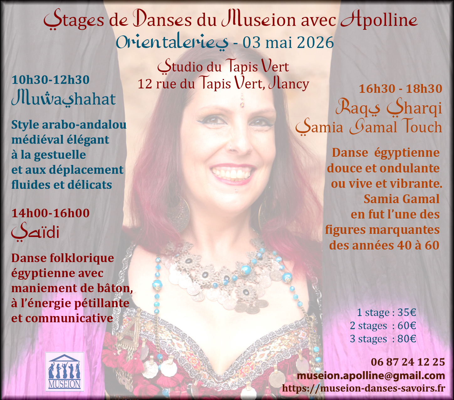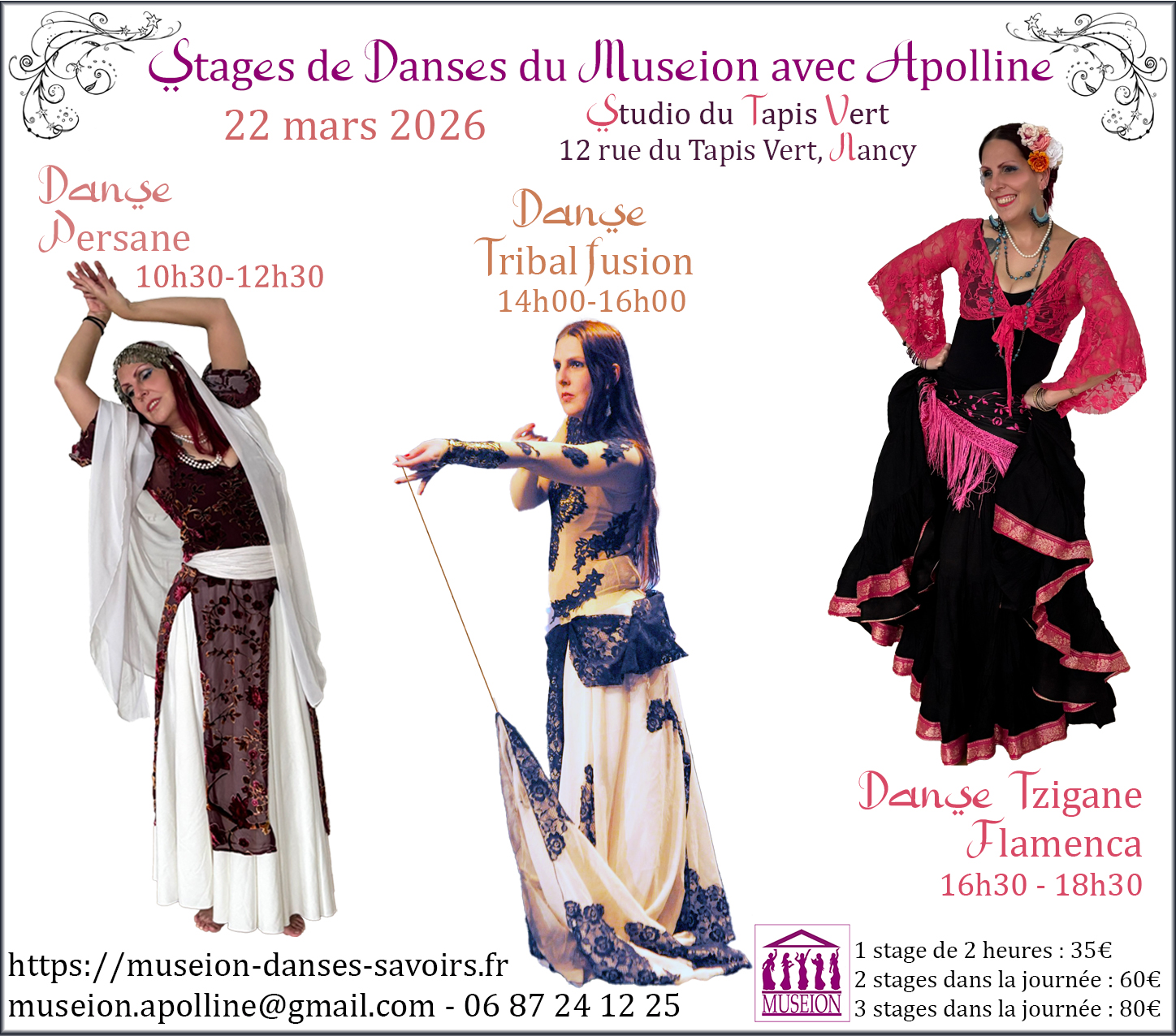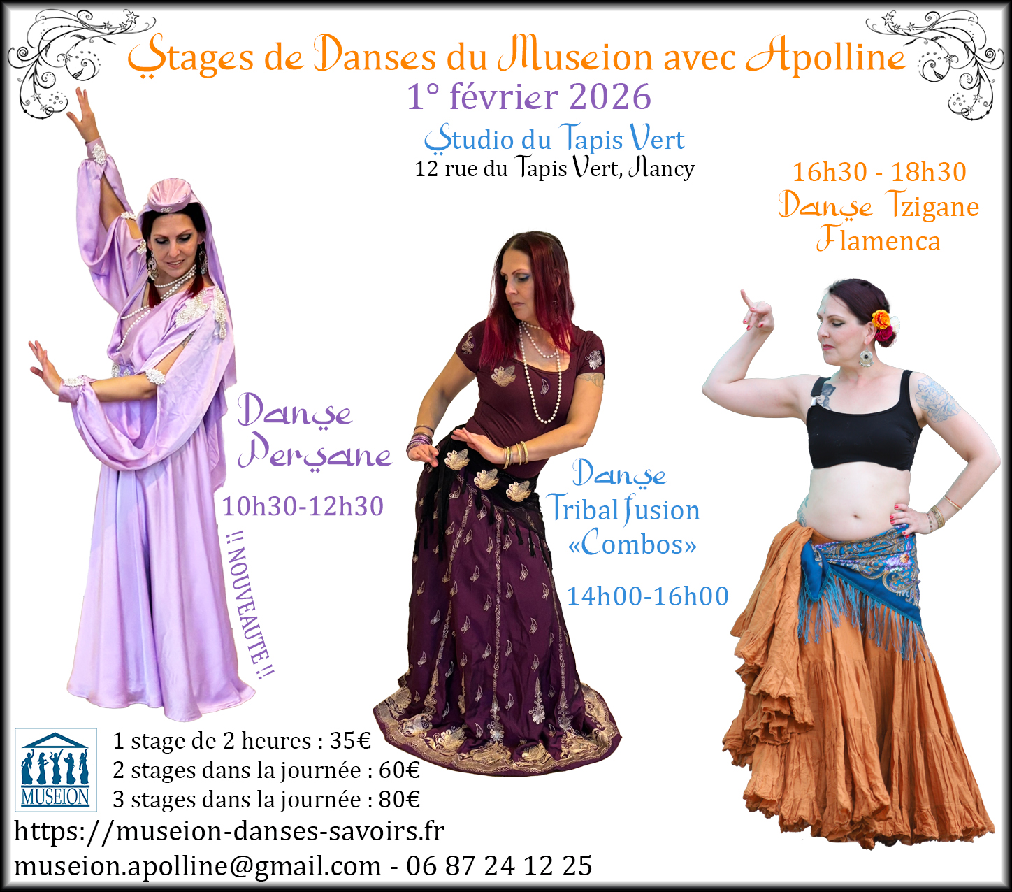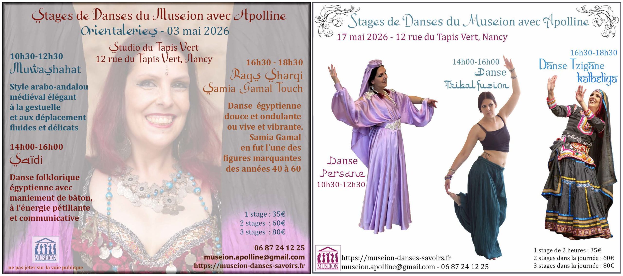 Les danses orientales, tziganes, ATS, tribal fusion et polynésienne dont l’enseignement est dispensé par mes soins, complétées régulièrement par et ponctuellement par d’autres genres grâce à des invités.